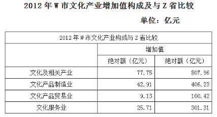 2012年,Z省W市實現(xiàn)文化及其相關(guān)產(chǎn)業(yè)增加值比上半年增長9.6%。在文化產(chǎn)品制造業(yè)中,文化印刷、文化用品制造和公益美術(shù)品制造三大主導(dǎo)行業(yè),2012年分別實現(xiàn)增加值21.82億元、11.57億元、6.62億元。