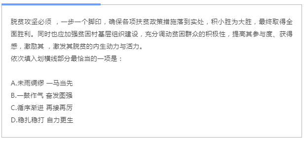 C項“循序漸進”是按一定的順序、步驟逐漸進步,符合文意。D項“穩(wěn)扎穩(wěn)打”比喻有把握、有步驟地工作,符合文意。然后 分析第二空。根據(jù)“激發(fā)其脫貧的內(nèi)生動力與活力”可知,這里強調(diào)的是主要依靠自身的力量。