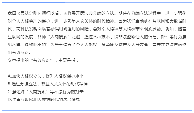 【解析】本題是語句理解題,側(cè)重考察對語句的理解是否全面和正確。首先找到 “有效應對”,它在文段最后一句“需要在立法層面做出有效應對”。根據(jù)就近原則向前找,“諸如此類的……需要……”,說明“有效應對”解決的是“此類行為”,而“此類”需繼續(xù)向前找,前一句是例如,表舉例,繼續(xù)向前找,“會對個人隱私權等人格權帶來顯示威脅”,故應對的是人格權帶來的威脅。所以 對比選項,A項提到“人格權”和“立法”。因此,選擇A選項。
