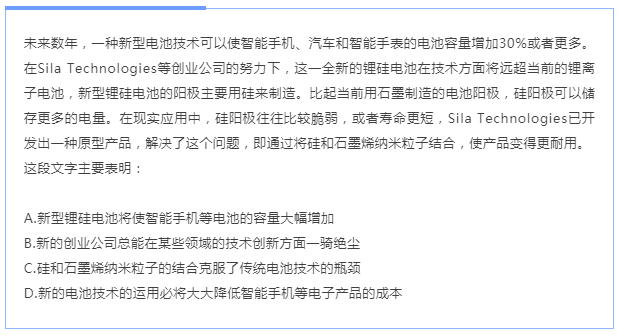【解析】這是一道主旨概括題。在 文段首句提出一種新型電池技術可以增加智能手機、汽車和智能手表的電池容量。后文明確該新型技術,并且通過兩方面分析了該技術能增加電池容量的原因,一是硅陽極可以存儲更多電量,二是硅和石墨烯納米粒子的結合可以解決硅陽極比較脆弱的問題。所以文段是“總—分”結構,確定文段的前兩句為主旨句,全文論述的核心話題為“全新的鋰硅電池”。之后 對比選項。A項是對文段重點的同義替換。因此,選擇A選項。