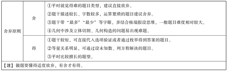 基礎計算、方程與不等式、工程問題、容斥問題和最值問題是基礎題型,運算簡單,套路固定,難度相對較低,是考場中性價比較高的題目,建議優(yōu)先去做。經濟利潤問題、行程問題、幾何問題和排列組合問題為每年的必考題型,其中幾何問題和排列組合問題的解題方法相對靈活,對考生的數(shù)學思維要求較高,但運算量較低,對圖形較為敏感或是對排列組合知識理解較為扎實的考生可以選擇此類題目