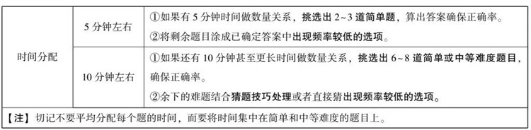 建議后置。對于大多數(shù)考生而言,數(shù)量關系建議放在最后一個模塊去做,但是放在最后并不代表完全舍棄。要想得高分,在眾多考生中脫穎而出,數(shù)量就是你的殺手锏。因為能得分的模塊,大家的得分差距不大,那你就需要在數(shù)量上比其他人多得幾分。在處理數(shù)量關系模塊時,應先將這個模塊的題目快速瀏覽一遍,先判斷試題難易,做到心中有數(shù)。然后把有限的時間分配給簡單或中等難度的題目。