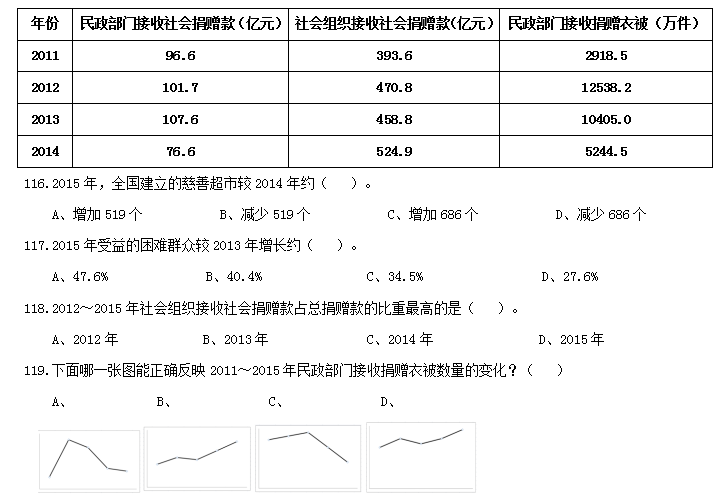 B、2015年民政部門接收捐贈(zèng)衣被同比增長(zhǎng)率高于2014年的二分之一