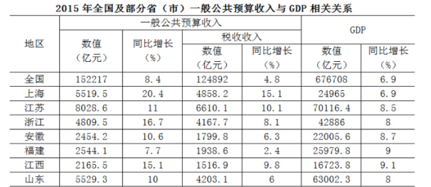 A、2015年上海一般公共預(yù)算收入占GDP的比值最高