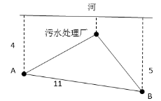 26.如下圖所示,某條河流一側(cè)有A、B兩家工廠(chǎng),與河岸的距離分別為4km和5km,且A與B的直線(xiàn)距離為11km。為了處理這兩家工廠(chǎng)的污水,需要在距離河岸1km處建造一個(gè)污水處理廠(chǎng),分別鋪設(shè)排污管道連接A、B兩家工廠(chǎng)。