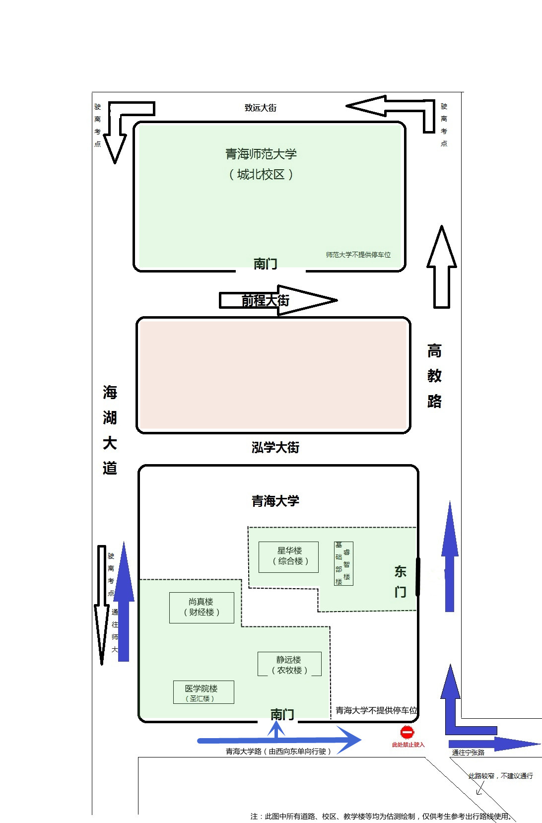 2、由于青大路交通管制,送考車輛只能由西向東單向行駛,在青海大學(xué)南門附近停車落客后,應(yīng)及時從寧張路駛離,也可經(jīng)高教路、泓學(xué)大街或致遠大街,從海湖大道駛離。