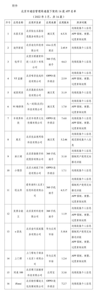 通報(bào)稱,2月25日,北京市通信管理局公開通報(bào)了65款存在侵害用戶權(quán)益問題的APP,截至通報(bào)規(guī)定時(shí)限,經(jīng)核查復(fù)檢,尚有16款A(yù)PP未按照要求完成整改。