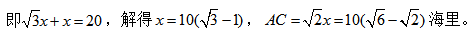 根據(jù)題意可知,BC=20海里,∠B=30°可構(gòu)造直角三角形來解題,過點(diǎn)A作AD垂直于BC,交BC于點(diǎn)D,則∠CAD=90°-45°=45°,設(shè)CD=x海里,則AD=CD=x海里,在直角三角形ADB中,由∠B=30°可知,