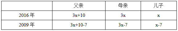 一家三口,父親的年齡比母親大10歲,2009年,父親的年齡是兒子的9倍,2016年,母親的年齡是兒子的3倍,則母親的出生年份為: