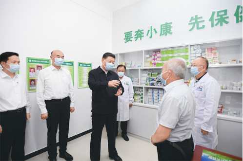2021年9月13日至14日,中共中央總書記、國家主席、中央軍委主席習近平在陜西省榆林市考察。這是14日下午,習近平在綏德縣張家砭鎮(zhèn)郝家橋村衛(wèi)生站同村里的老人、醫(yī)護人員親切交流。新華社記者李學仁/攝