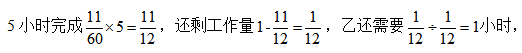 有一項工作,甲單干需要10個小時完成,乙單干需要12個小時完成。甲、乙兩人同時工作5小時后,甲另有其他的事情去做,只有乙繼續(xù)工作,那么完成這項工作共用了( )小時。
