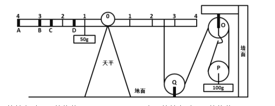 85.如圖所示,地面上有一架天平,天平左端系有一個50g的物體,右端通過繩子連接一組滑輪?;喗M合中,O、Q為定滑輪,P為動滑輪,下端系有一個100g的物體。要使天平兩端平衡,需要的操作是( )。