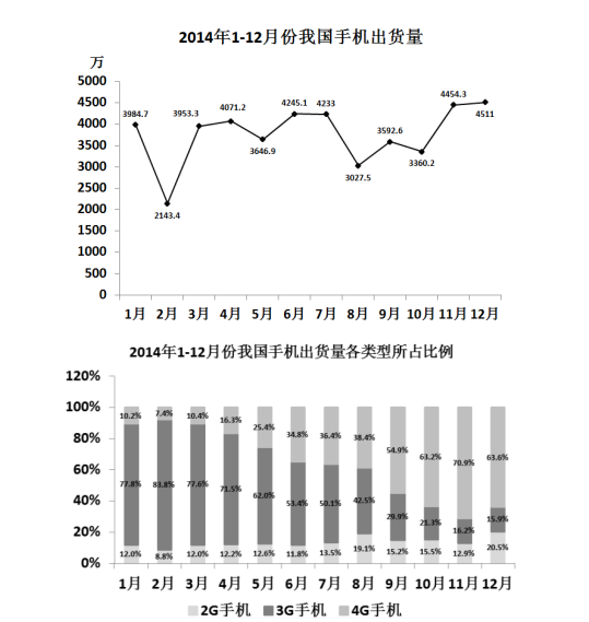 B.2014年2月,我國2G手機(jī)和4G手機(jī)的出貨量均為全年最低