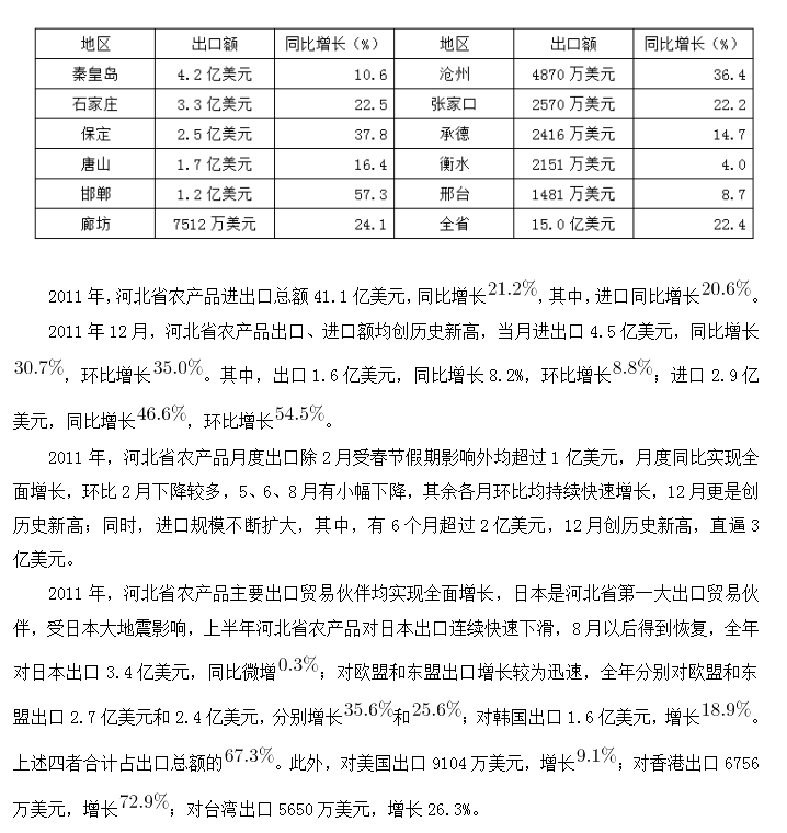 C、雖然受到日本大地震的影響,2011年河北省農(nóng)產(chǎn)品對(duì)日本的出口貿(mào)易額還是保持了正增長