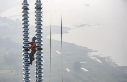 2021年12月5日,在白鶴灘—江蘇±800千伏特高壓直流輸電線路工程(重慶段)江津長江大跨越施工現(xiàn)場,工人在長江上空作業(yè)。新華社記者黃偉/攝
