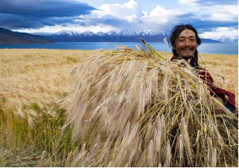 2021年9月23日,西藏那曲市尼瑪縣文部鄉(xiāng)文部南村村民開鐮收割。文部南村位于當(dāng)惹雍措湖畔,海拔4645米,這里的村民以“薩馬卓”(半農(nóng)半牧之意)為主,在藏北高原獨(dú)具特色。新華社記者普布扎西/攝