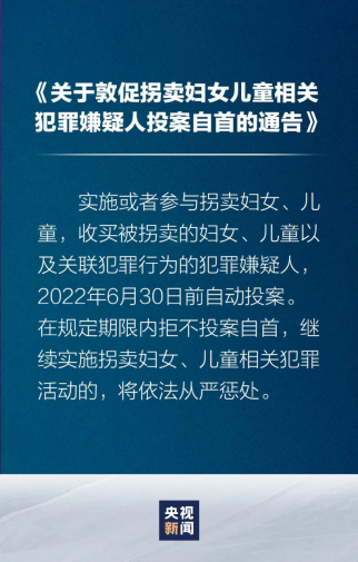 《通告》指出,實(shí)施或者參與拐賣(mài)婦女、兒童,收買(mǎi)被拐賣(mài)的婦女、兒童以及關(guān)聯(lián)犯罪行為的犯罪嫌疑人,自本通告發(fā)布之日起至2022年6月30日前自動(dòng)投案,如實(shí)供述自己罪行的,可以依法從輕或者減輕處罰;犯罪較輕的,可以依法免除處罰。在規(guī)定期限內(nèi)拒不投案自首,繼續(xù)實(shí)施拐賣(mài)婦女、兒童相關(guān)犯罪活動(dòng)的,將依法從嚴(yán)懲處。犯罪嫌疑人要認(rèn)清形勢(shì),盡快投案自首,爭(zhēng)取從寬處理。