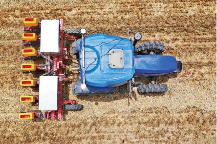 2020年5月26日,在河南省鄧州市小楊營鎮(zhèn)安眾村,加裝有北斗導(dǎo)航系統(tǒng)的拖拉機(jī)在無人駕駛狀態(tài)下播種。新華社記者馮大鵬/攝