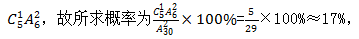 5排共有30個格子,每排格子數相同,則每排有30÷5=6個格子。由于兩個棋子相互制約,并且先放綠色還是先放紅色不影響最終結果,并且第一個棋子選哪個位置,并不會影響第二個棋子的放置,所以我們可以用定位法去處理。先從30個格子中任選1個安排紅色棋子,此時還剩下29個空格子。若想2個棋子在同一排,則綠色棋子只能挑選紅色棋子所在排剩余5個格子中的一個,故2個棋子在同一排的概率為