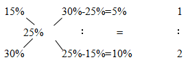 【答案】C【解析】題目中給出的初始鹽水濃度分別為15%和30%,混合后的濃度為25%,則可以直接用十字交叉法求出初始兩種濃度鹽水的用量之比,具體操作如下: