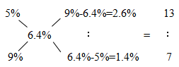 【答案】A【解析】已知,題目中給出的初始糖水濃度分別為5%和9%,混合后的濃度為6.4%,則可以直接用十字交叉法求出初始兩種濃度糖水的用量之比,具體操作如下:
