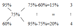 例3:若要將300克濃度為95%的酒精與若干濃度為60%的酒精,混合成濃度為75%的酒精,則需要濃度為60%的酒精( )克。