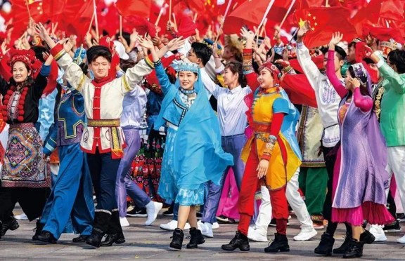 2019年10月1日,在慶祝中華人民共和國成立70周年群眾游行隊伍中,身著民族盛裝的青年們熱情揮手。中國青年報·中國青年網(wǎng)記者李雋輝/攝