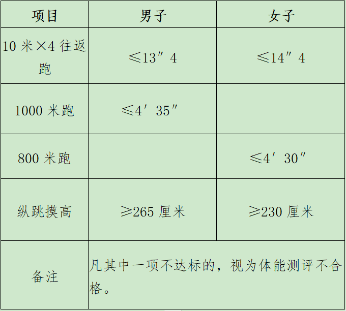 3.現(xiàn)場測評。工作人員引導(dǎo)考生到測評現(xiàn)場,對考生進(jìn)行體能測評,考官當(dāng)場記錄考生測評成績并作出評判。除10米×4往返跑項目測評次數(shù)不超過2次外,其他項目只允許考生進(jìn)行一次測評,不允許進(jìn)行二次補測,體能測評合格的方可進(jìn)入體檢環(huán)節(jié)。
