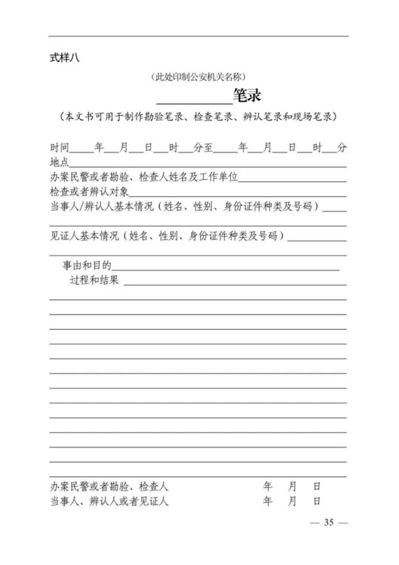 “見證人基本情況”只適用于制作檢查筆錄、現(xiàn)場筆錄時被檢查人或者當(dāng)事人不在場的情形。被檢查人或者當(dāng)事人在場的,不需要見證人,“見證人基本情況”后面的橫線處填寫“無”,并由被檢查人或者當(dāng)事人、辦案民警在筆錄上簽名;被檢查人或者當(dāng)事人不在場的,應(yīng)當(dāng)在“見證人基本情況”后面的橫線處填寫見證人的姓名、性別、身份證件種類及號碼,并由見證人、辦案民警在筆錄末尾簽名。