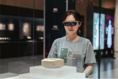 圖為2022年4月,游客在良渚博物院體驗(yàn)AR導(dǎo)覽眼鏡。盛淑彥/攝杭州良渚遺址管理區(qū)管理委員會供圖