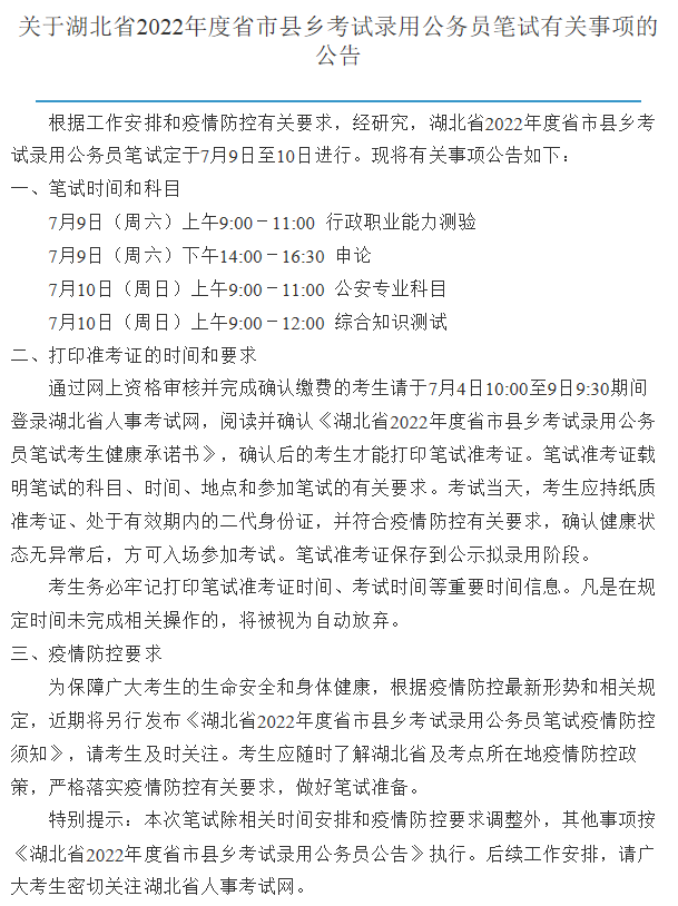 最新消息!2022年湖北公務員考試筆試時間公布:7月9-10日舉行!官方通知如下: