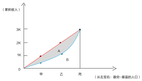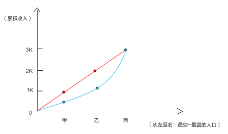假設(shè)現(xiàn)在H國中僅有3個人,分別為甲乙丙,甲年收入為0.5K,乙年收入為0.8K,丙年收入為1.7K,按照之前的累積收入計算方式,甲對應(yīng)的累積收入0.5K,乙對應(yīng)的累積收入1.3K(乙對應(yīng)的累積收入=甲+乙),丙的累積收入3K,(丙對應(yīng)的累計收入=甲+乙+丙),將三點連成藍色的線,就有了情況二中H國的洛倫茲曲線。