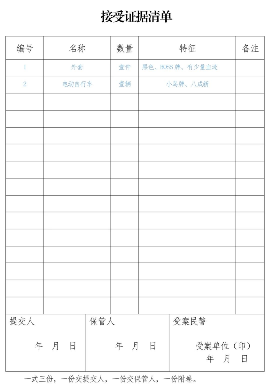接受證據(jù)清單一式三份,一份交提交人,一份交保管人,一份附卷。在提交人提交證據(jù)時(shí),由提交人和接受民警簽名確認(rèn)。當(dāng)有關(guān)證據(jù)作為涉案財(cái)物進(jìn)行保管時(shí),由保管人在辦案單位保存的一份接受證據(jù)清單上簽名確認(rèn)。保管人簽名確認(rèn)后的接受證據(jù)清單,應(yīng)當(dāng)附卷。