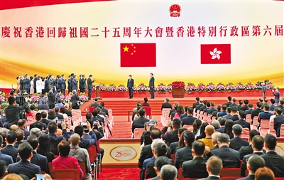 7月1日上午,慶祝香港回歸祖國25周年大會(huì)暨香港特別行政區(qū)第六屆政府就職典禮在香港會(huì)展中心隆重舉行。中共中央總書記、國家主席、中央軍委主席習(xí)近平出席并發(fā)表重要講話。這是習(xí)近平監(jiān)誓,香港特別行政區(qū)第六屆政府主要官員在李家超帶領(lǐng)下宣誓就職。