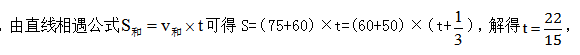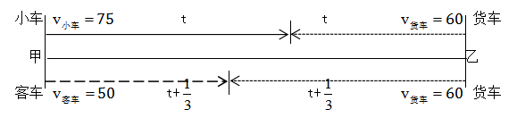 例題:小車(chē)、客車(chē)從甲地開(kāi)往乙地,貨車(chē)從乙地開(kāi)往甲地,它們同時(shí)出發(fā),貨車(chē)與小車(chē)相遇20分鐘后又遇客車(chē)。已知小車(chē)、貨車(chē)和客車(chē)的速度分別為75千米/時(shí)、60千米/時(shí)和50千米/時(shí),則甲、乙兩地的距離是:( )