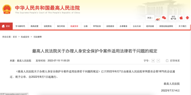 7月15日,最高人民法院發(fā)布《關(guān)于辦理人身安全保護令案件適用法律若干問題的規(guī)定》