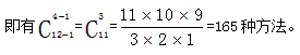 如按照以上的方式插入隔板的話相當(dāng)于A分2個元素,B和C分1個元素,D分4個元素。隨著隔板所選的3個間隔的不同,產(chǎn)生不同的數(shù)量分配,但是每一個對象至少要分1個,只能在中間的7個間隔里選3個插入隔板。則總方法數(shù)應(yīng)為