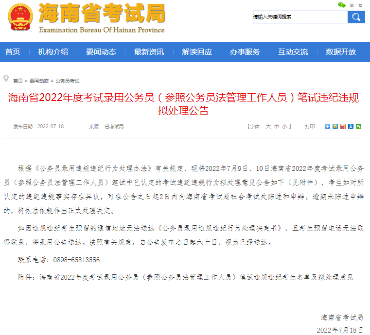 公告顯示,按《公務(wù)員錄用違規(guī)違紀(jì)行為處理辦法》有關(guān)規(guī)定,將2022年7月9日、10日海南省2022年度考試錄用公務(wù)員(參照公務(wù)員法管理工作人員)筆試中已認(rèn)定的考試違紀(jì)違規(guī)行為擬對相關(guān)考生作出相應(yīng)科目(場次)考試成績?yōu)榱愕奶幚怼?/p>