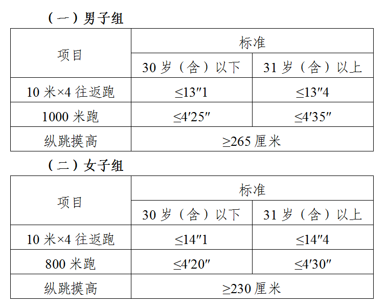 體能測(cè)評(píng)三項(xiàng)全部達(dá)標(biāo)方為合格。報(bào)考緊缺職位的人員,體能測(cè)評(píng)項(xiàng)目3項(xiàng)中有2項(xiàng)達(dá)標(biāo)的,視為合格。體能測(cè)評(píng)項(xiàng)目中,縱跳摸高的測(cè)試次數(shù)不超過3次(當(dāng)場(chǎng)),10米×4往返跑的測(cè)試次數(shù)不超過2次(當(dāng)場(chǎng)),男子1000米跑和女子800米跑項(xiàng)目的測(cè)試次數(shù)均為1次。