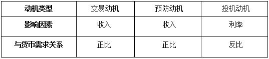 最后,我們可以總結(jié)出以上三種動機(jī)影響貨幣需求的因素及關(guān)系。交易動機(jī)和預(yù)防動機(jī)帶來的貨幣需求與利率沒有直接關(guān)系,它是收入的函數(shù),并且與收入成正比;而投機(jī)動機(jī)帶來的貨幣需求則與利率成反比,因為利率越高人們持有貨幣進(jìn)行投機(jī)的機(jī)會成本也就越高。