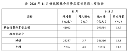 例1:2021年1-11月我國(guó)社會(huì)消費(fèi)品零售總額399554億元,同比增長(zhǎng)13.7%。其中11月社會(huì)消費(fèi)品零售總額41043億元。按經(jīng)營(yíng)地分,1-11月城鎮(zhèn)社會(huì)消費(fèi)品零售總額346316億元,同比增長(zhǎng)13.8%;鄉(xiāng)村社會(huì)消費(fèi)品零售總額53239億元,同比增長(zhǎng)13.3%。11月城鎮(zhèn)社會(huì)消費(fèi)品零售總額35337元,同比增長(zhǎng)3.7%;鄉(xiāng)村社會(huì)消費(fèi)品零售總額5703億元,同比增長(zhǎng)4.8%。